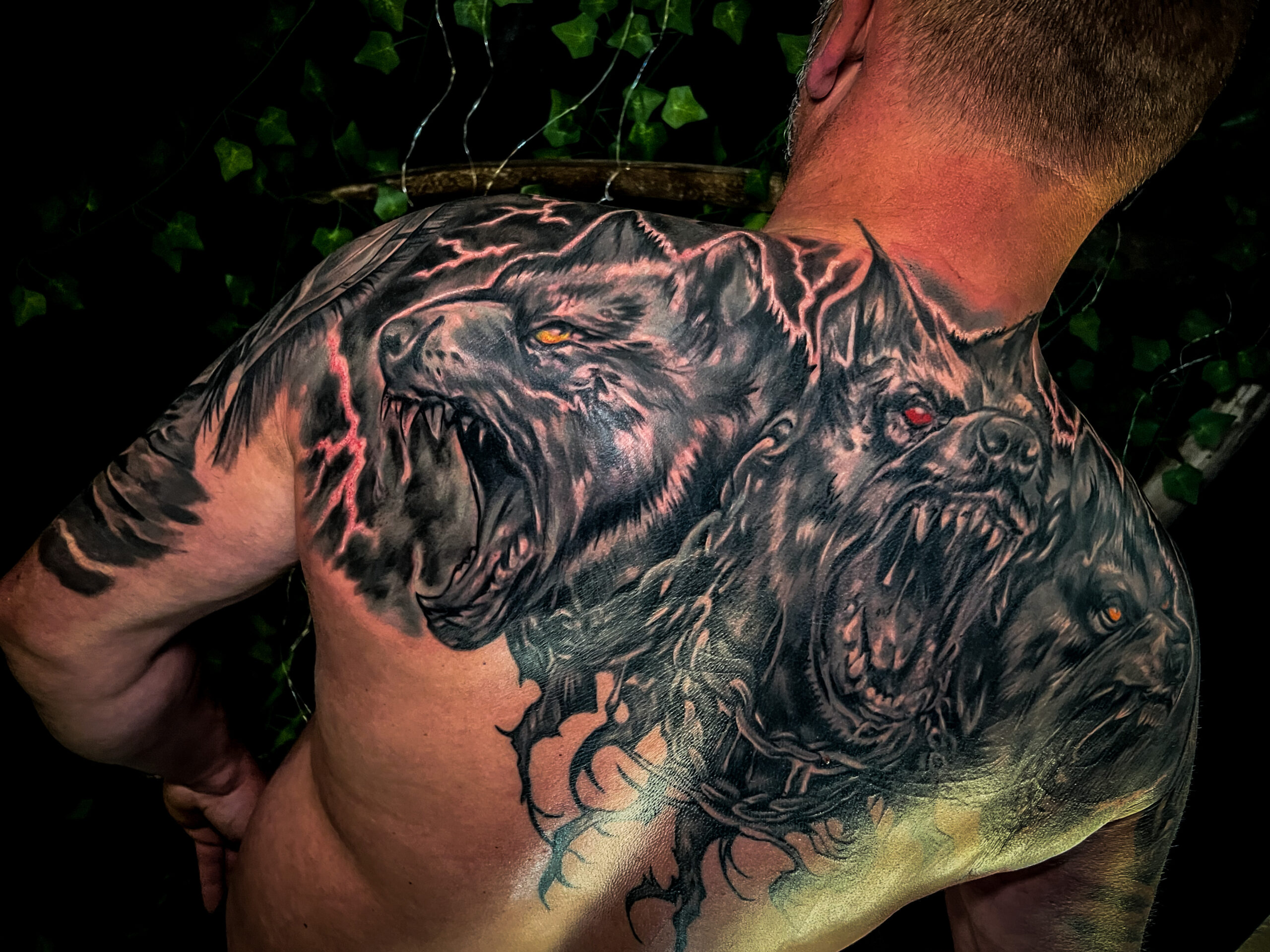 Tatuaż Cerbera w stylu realistycznym na plecach