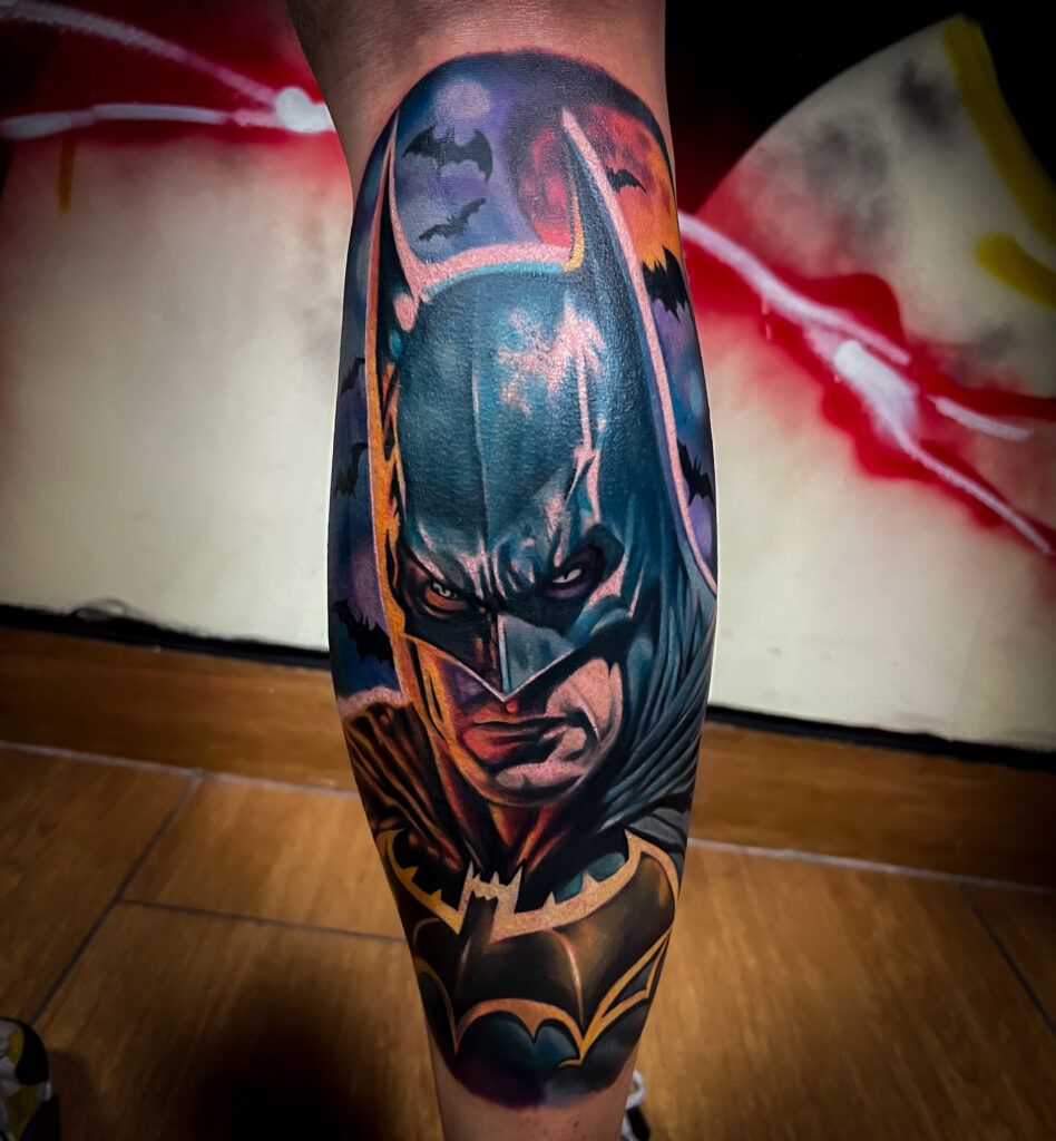 Tatuaż Batmana w stylu realistycznym na łydce