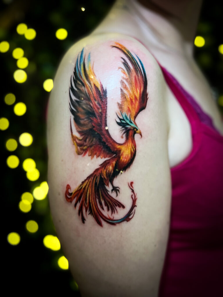 Tatuaż feniksa w stylu neo traditional na ramieniu