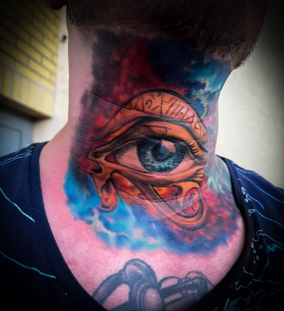 Tatuaż oka Horusa w stylu surrealistycznym na szyi